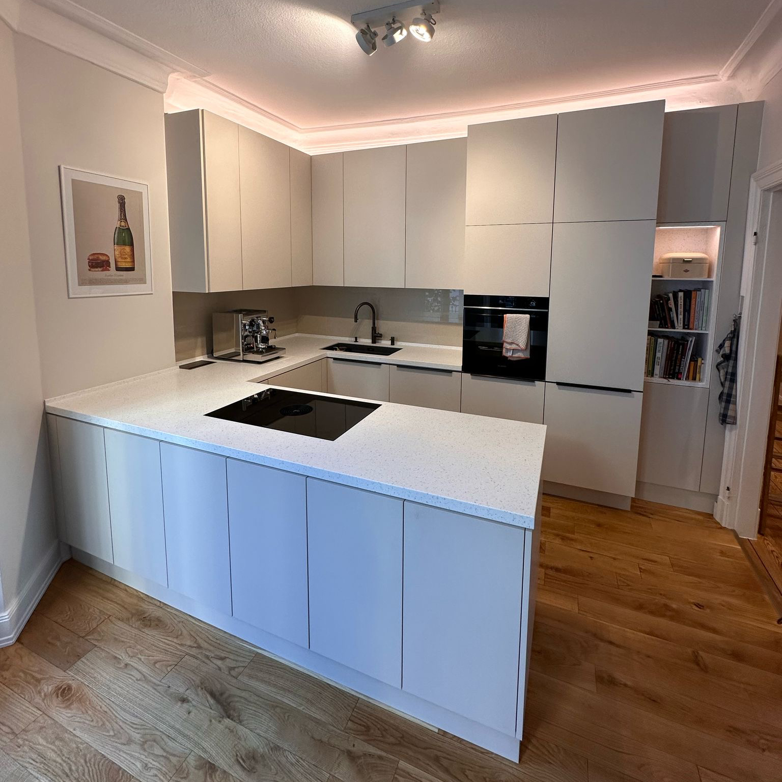 Moderne Stadtwohnungsküche in hellem Design mit viel Stauraum
