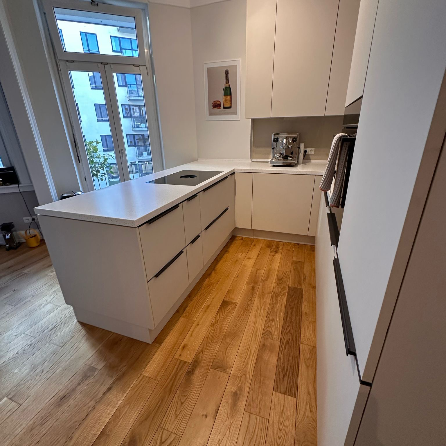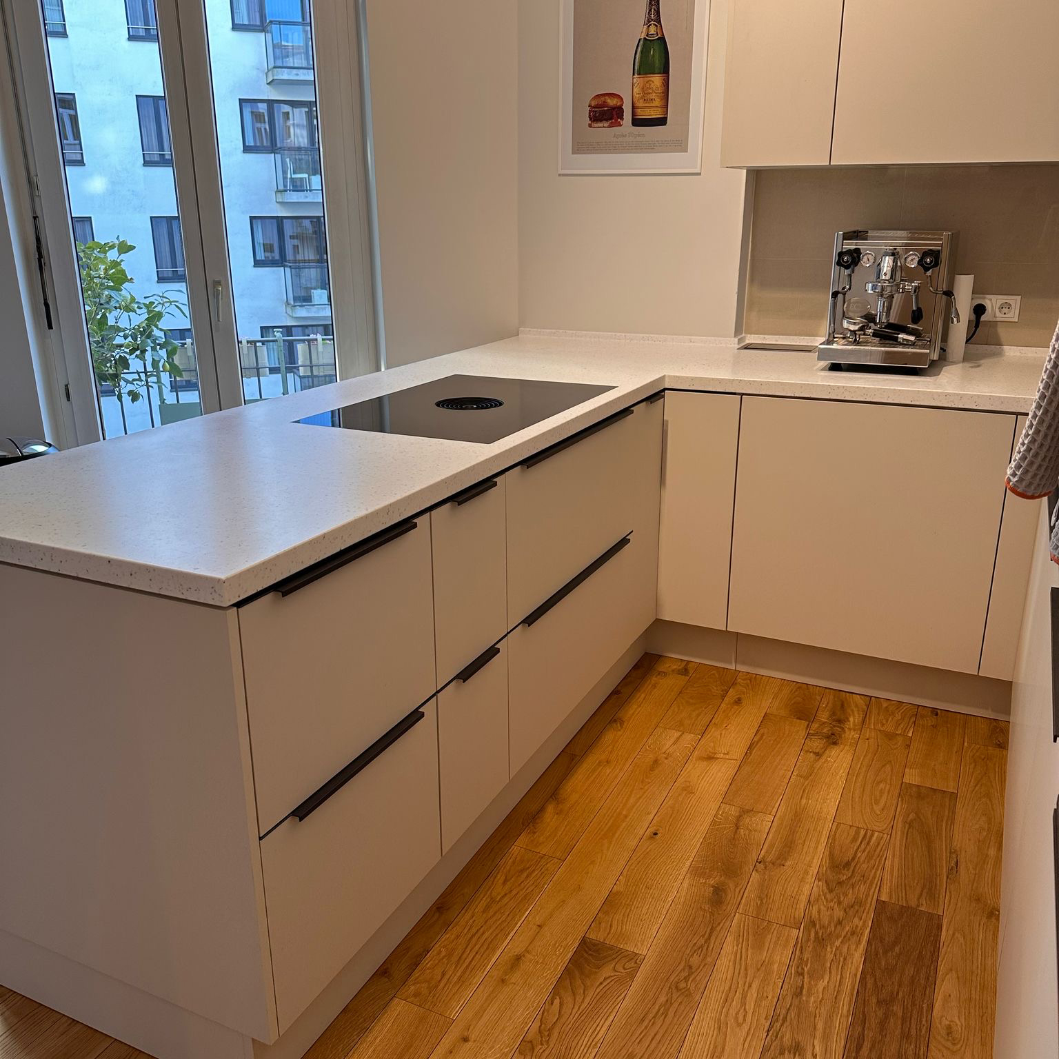 Moderne Stadtwohnungsküche in hellem Design mit viel Stauraum