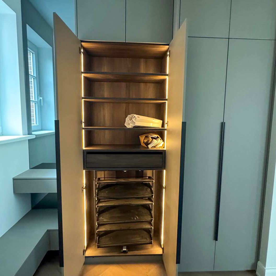 Unsere Schränke sind so individuell wie Ihre Ansprüche – mit flexiblen Fachhöhen, integrierten Schubkästen, Auszügen oder Kleiderliften. Durch die Kombination von Design, Licht und Funktion entsteht ein einzigartiges Möbelstück, das Komfort und Ästhetik verbindet.