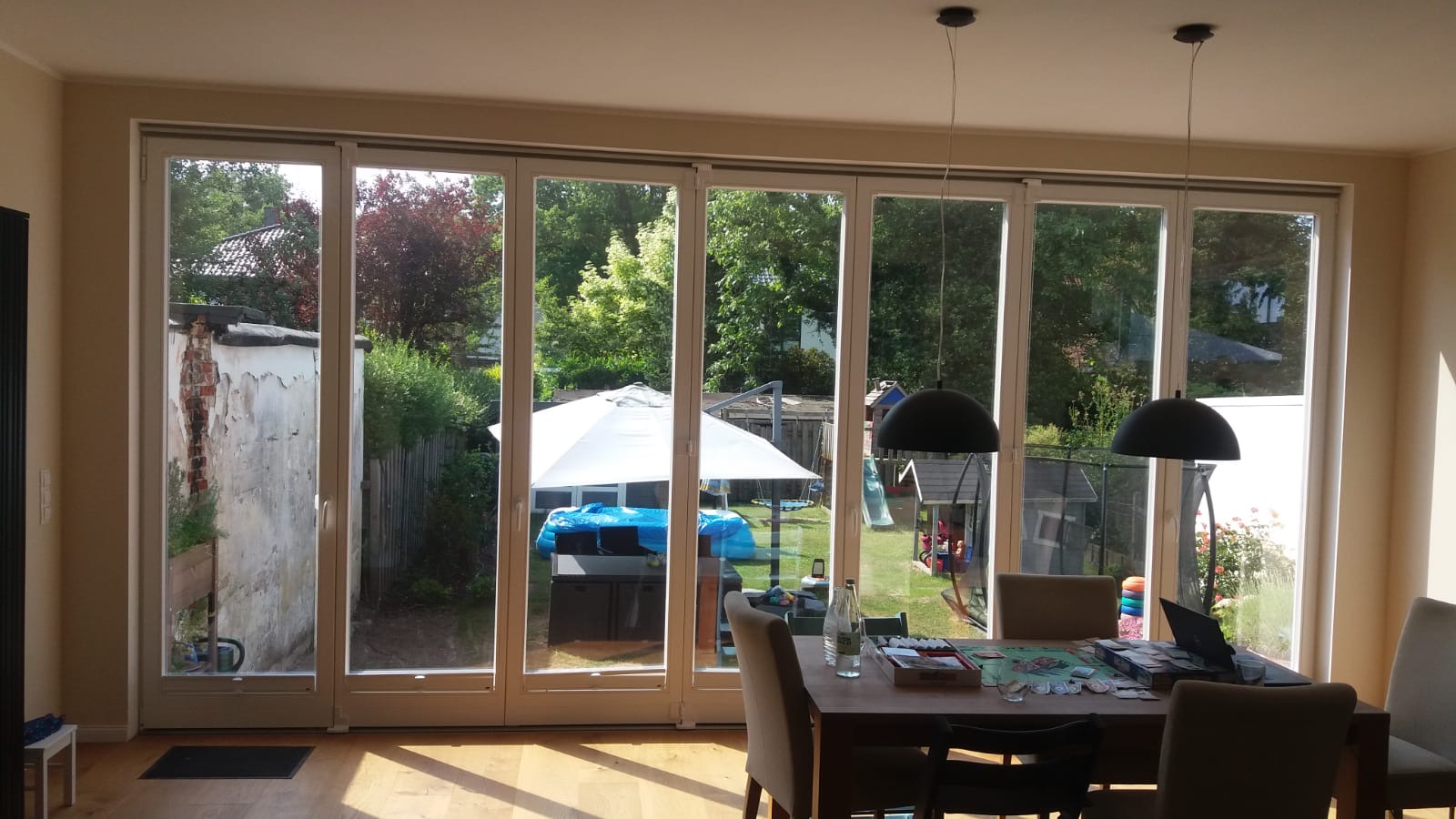 Durch die neue Fensterfront fällt deutlich mehr Tageslicht ein, der Blick in den Garten öffnet sich und der Raum wirkt sofort größer und einladender. Besonders in den Sommermonaten verbindet die Anlage Wohnraum und Terrasse zu einer harmonischen Einheit.